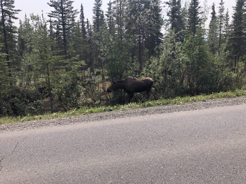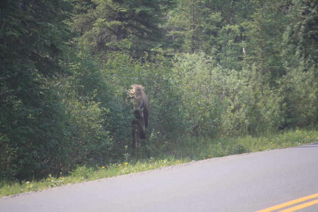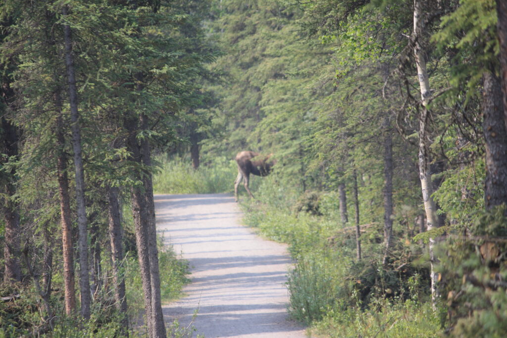 That is a moose butt. We’d been reading signs that said not to approach a moose within 25 yards. We were well over 25 yards which is why I felt it would be ok to take a picture. The signs we’d seen said never run from a bear or from a wolf, but feel free to run from a moose. It was probably better not to be so close that running might be required, so after waiting for a few minutes feeling that we couldn’t proceed we decided to cut over to the road which ran parallel to the path. By the time we crossed the thin strip of brush the moose had also crossed.