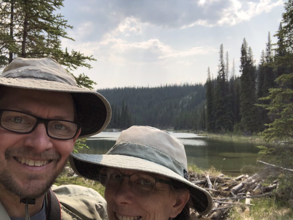 We finally made it to the trailhead and began the descent to the lake. It was a popular path and in the few miles we must have seen a hundred people. The lake had a couple of interesting sections of rock, multiple beaver dams and, at one point, is so close to the Nenana River that I can imagine them merging at certain times of the year. Here we are with a beaver dam in the background. Inspired by earlier pictures with half of a moose, we gave Arlene only half of a head.