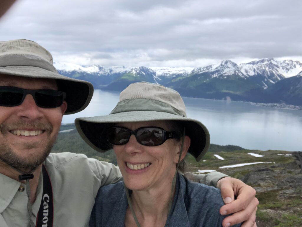 The view from where we turned around was amazing since we were standing not on Alice Mountain but another high point where the terrain fell away in all directions so quickly that simply standing felt precarious. We could look down on Resurrection Bay and across the bay was Seward stretched along the base of more mountains including Mount Marathon which would be the setting for a race later in the day. Here are two usies from the same spot; one is roughly east and one is roughly west toward Seward.