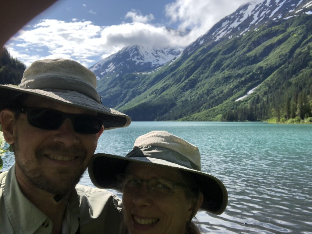 In many places the path was nearly overgrown. We’re supposed to make noise so any bears around know that we’re there. Today the noise was me complaining about the overgrown path. Eventually we arrived at this lake: