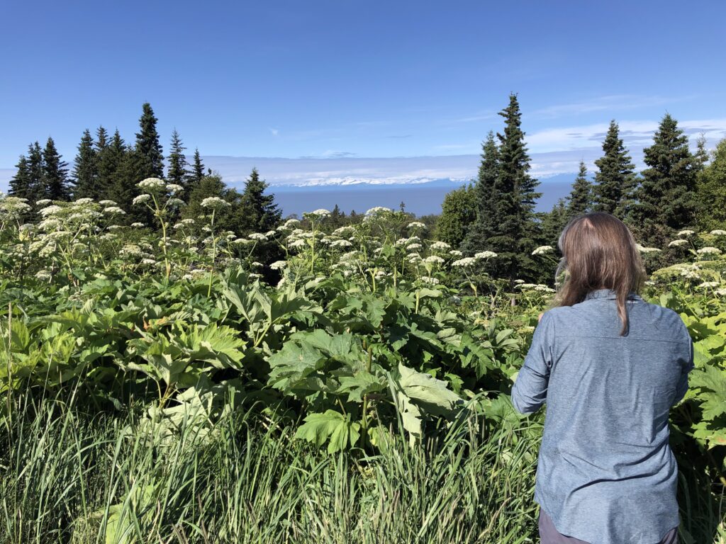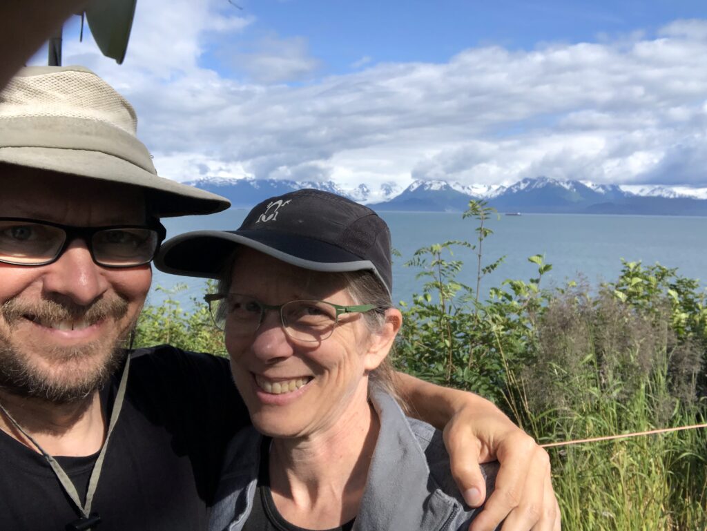 After Soldotna we turned south an occasionally saw views of the volcanic mountains on the other side of Cook Inlet. Of course, we had to take our own picture in front of them.