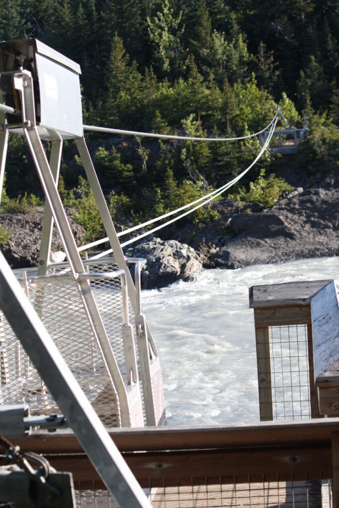 We walked along the beach to find the trailhead which was marked with orange signs then followed the path for 1.4 miles until we reached a decision point. One way went toward Grewingk Lake (which was one of the main goals of the hike) and the other went out to what we thought would be a view of the Grewingk Glacier. We started toward the view and instead found this tram across a glacier runoff river.