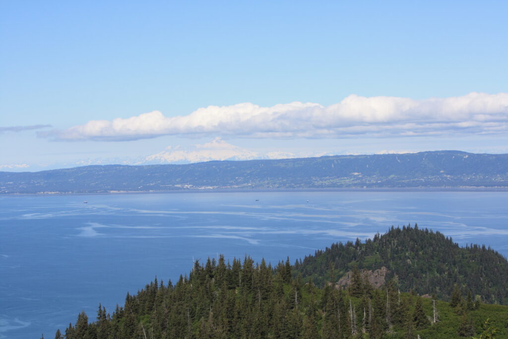 We didn’t make it to the top; we needed to turn around to get back in time for the return trip and we’d covered only 1.5 miles in 80 minutes. Oh, well. But there was this mountain on the other side of Cook Inlet that we could see.
