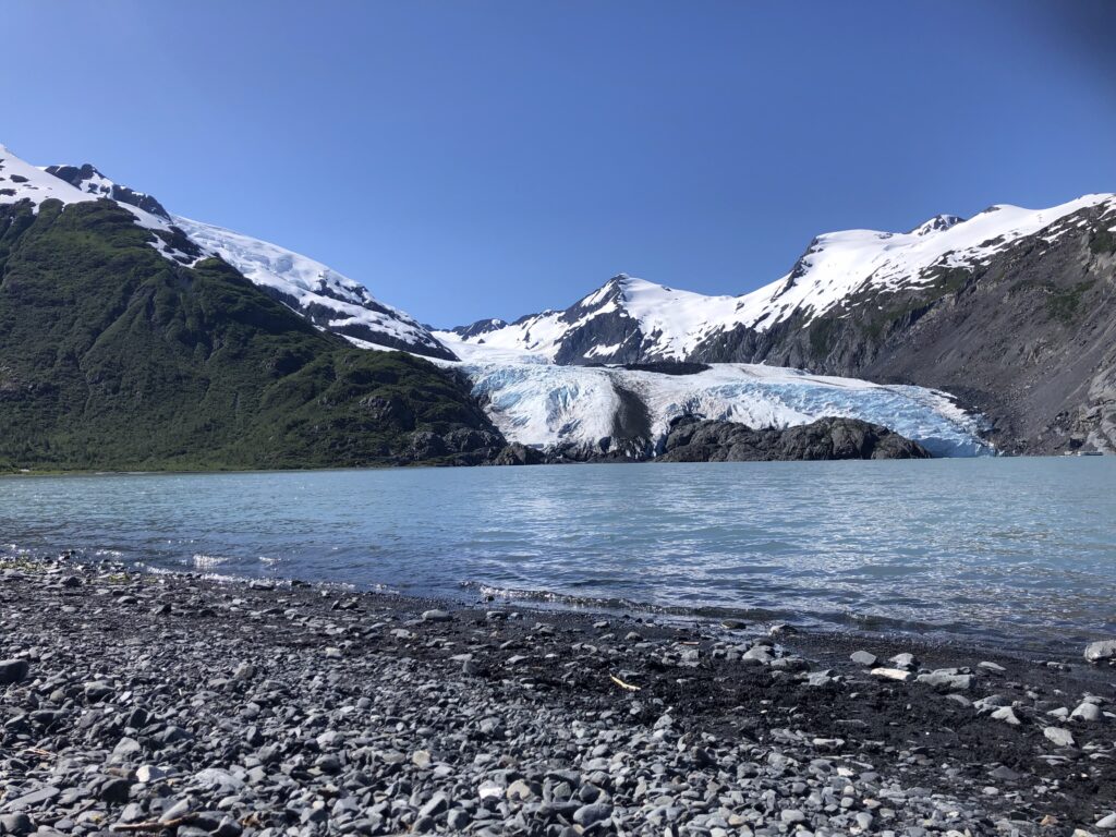 Portage Lake is the one by the glacier. I’m not sure if the puddle has a name. We we arrived at the lake to see several groups of people were sitting in the gravel and taking in the view; the sun was out, the temperature was nice and the winds were mild.