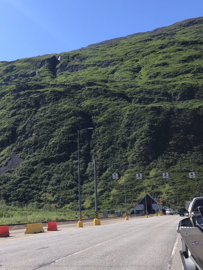 On Thursday we went to Whittier. There is only one road from Anchorage to Whittier and it involves a single lane tunnel that runs under Maynard Mountain and is 2.5 miles long. The single lane contains a set of railtracks as well and, in fact, from when the tunnel was constructed in the early 1940s until about 2000, only trains went through the tunnel. Now cars are allowed to go from the Whittier side to the Anchorage side on the hour and in the opposite direction on the 30s. I don’t know exactly how they work in the trains. Here is the entrace to the tunnel from the Whittier side: