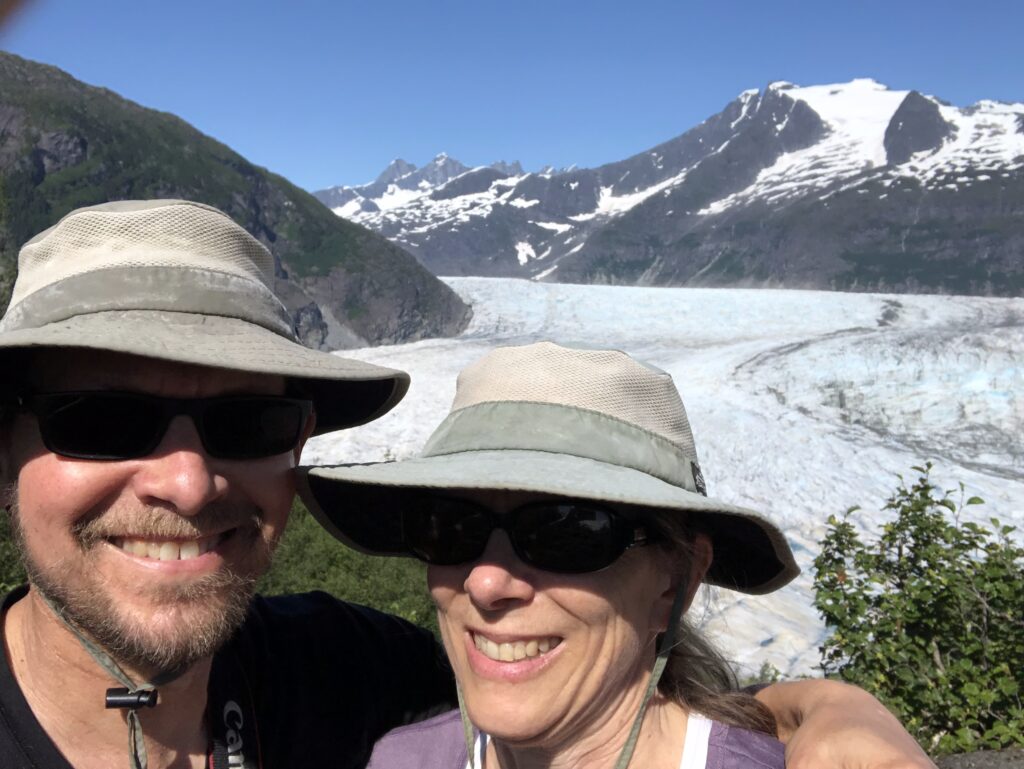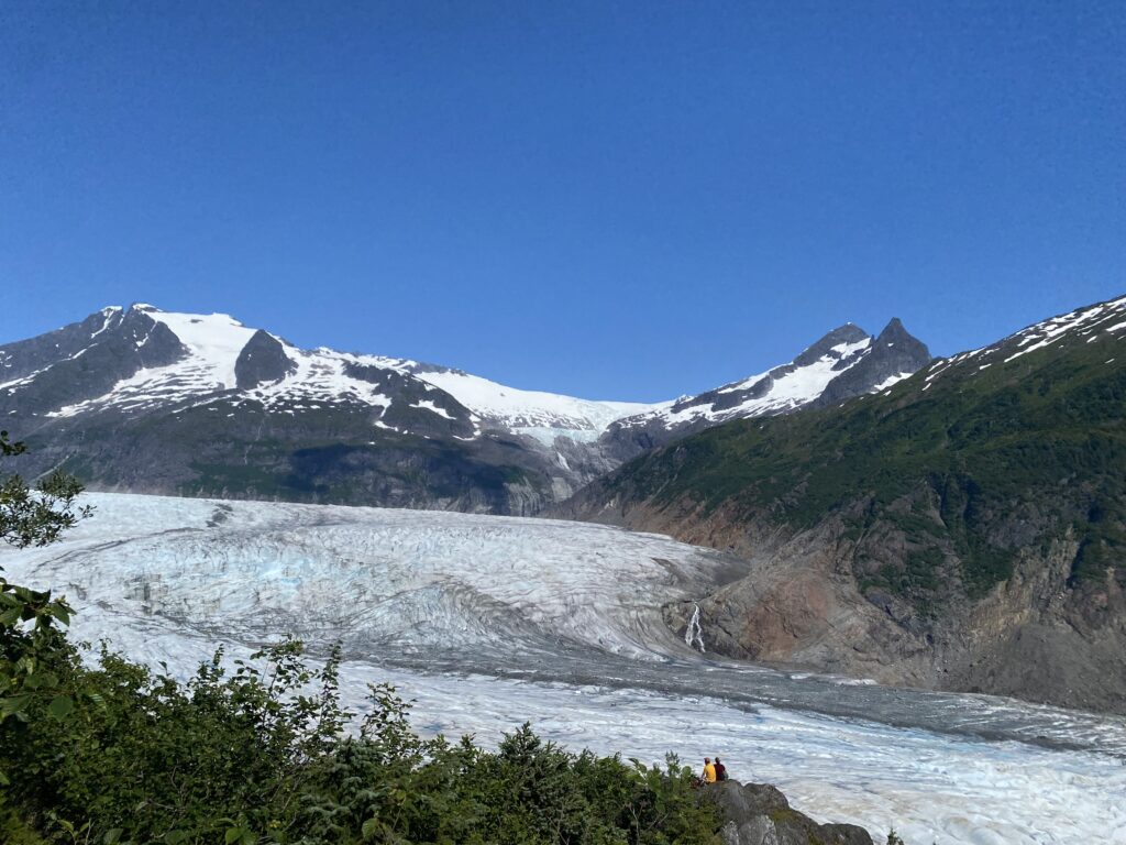 The trail was supposed to be about 7 miles with 1400 feet of vertical which doesn’t sound bad, but all of the climbing was focused on the end which meant that there were places with stair cases carved into the rock and other places where we were using ropes to help maintain balance on exposed granite. The weather was mostly not too hot and we ended up with one of the best glacier views that we’ve had. (This is Mendenhall Glacier, again.)